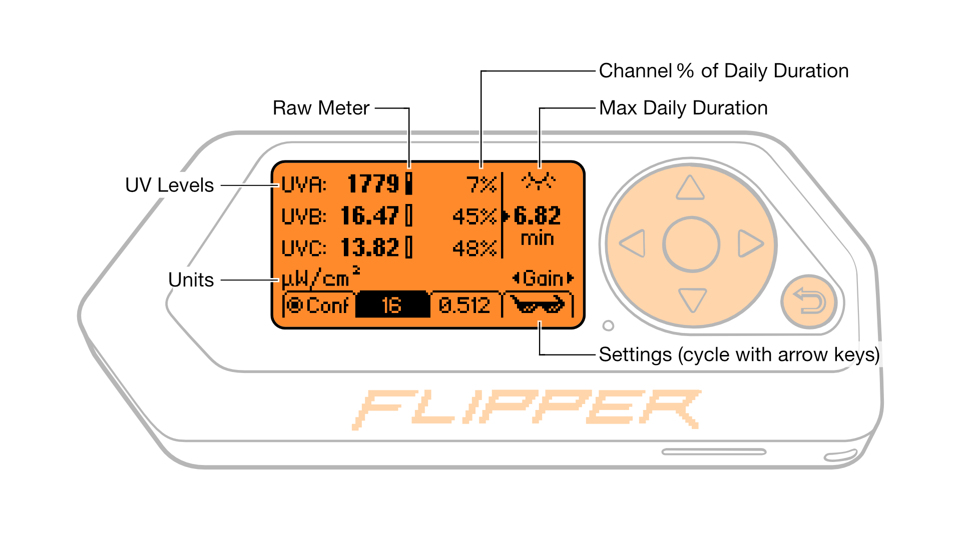 Next to each UV reading is a small meter indicating the raw sensor value. If this value is too high or too low, a warning symbol will appear, signaling potential sensor overexposure or underexposure. This condition will probably result in unreliable measurements. Adjusting the Gain and Exposure Time settings (similar to camera ISO and shutter speed) at the bottom of the screen can help correct this.
